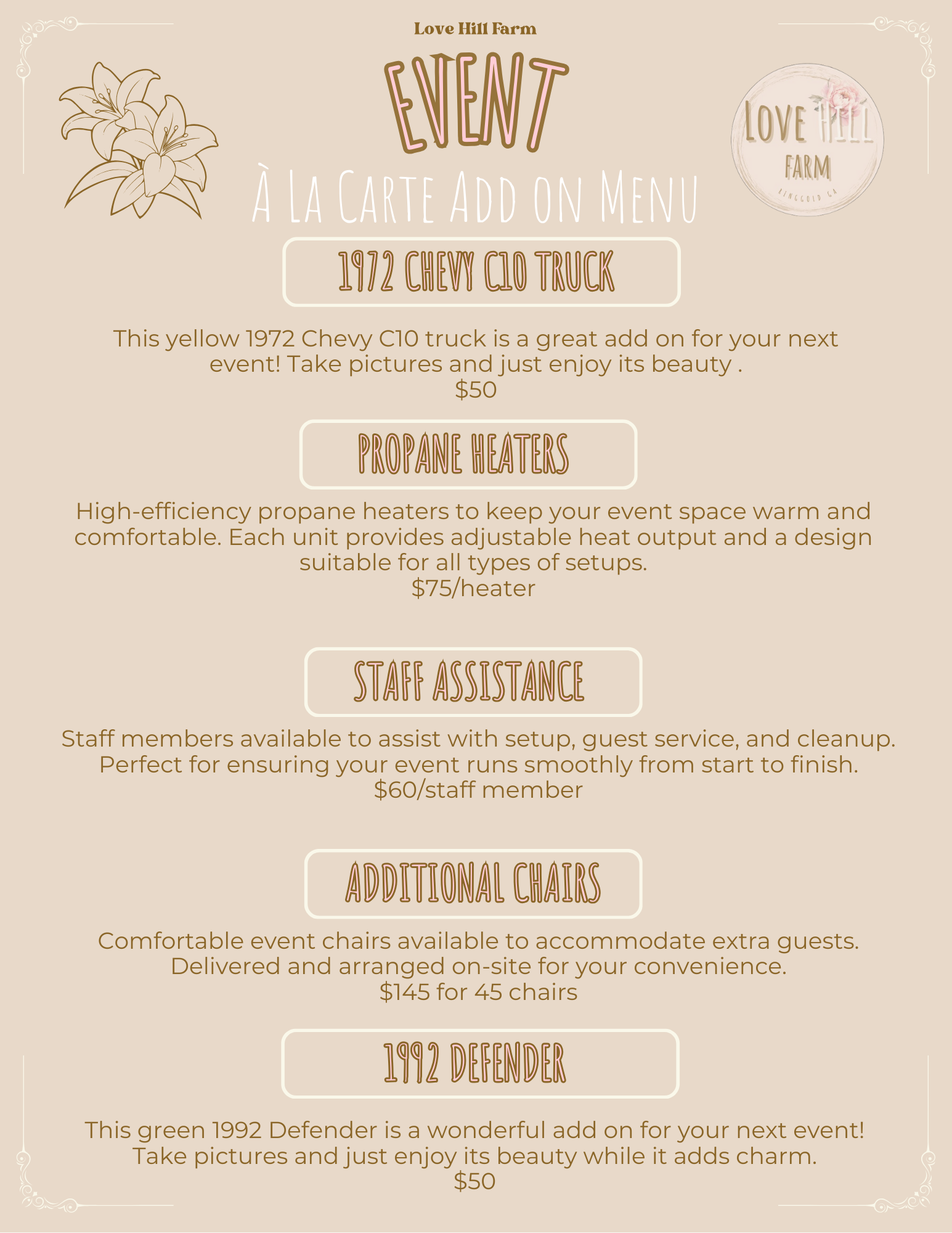 Let us help make that event even MORE special by adding on our event options. By selecting one or multiple of these options, you are enhancing your event with a la carte add ons for you and your group to enjoy!