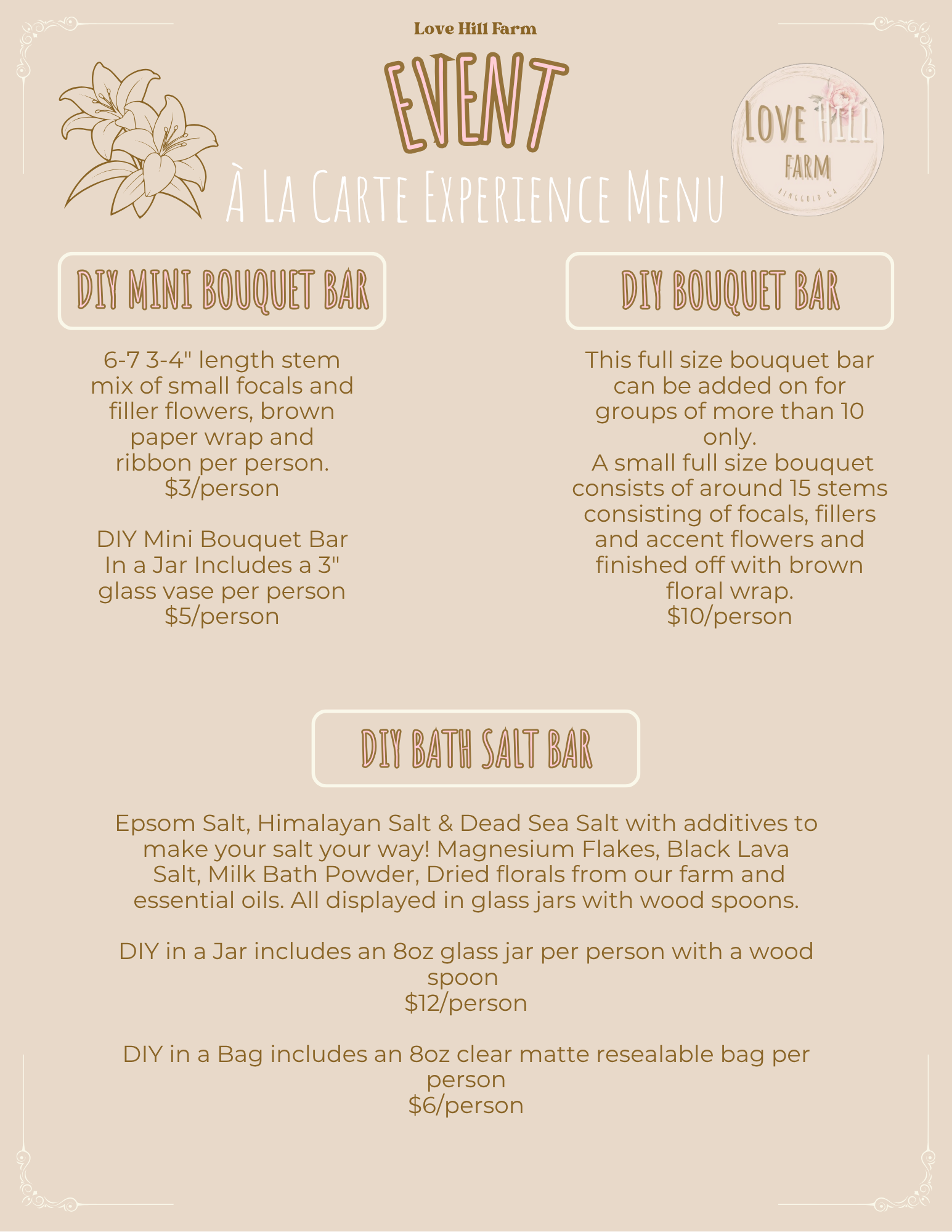 DIY Bouquet Bar- This full size bouquet bar can be added on for groups of more than 10 only. A small Full size bouquet consists of around 15 stems consisting of focals, fillers and accent flowers and finished off with brown floral wrap.