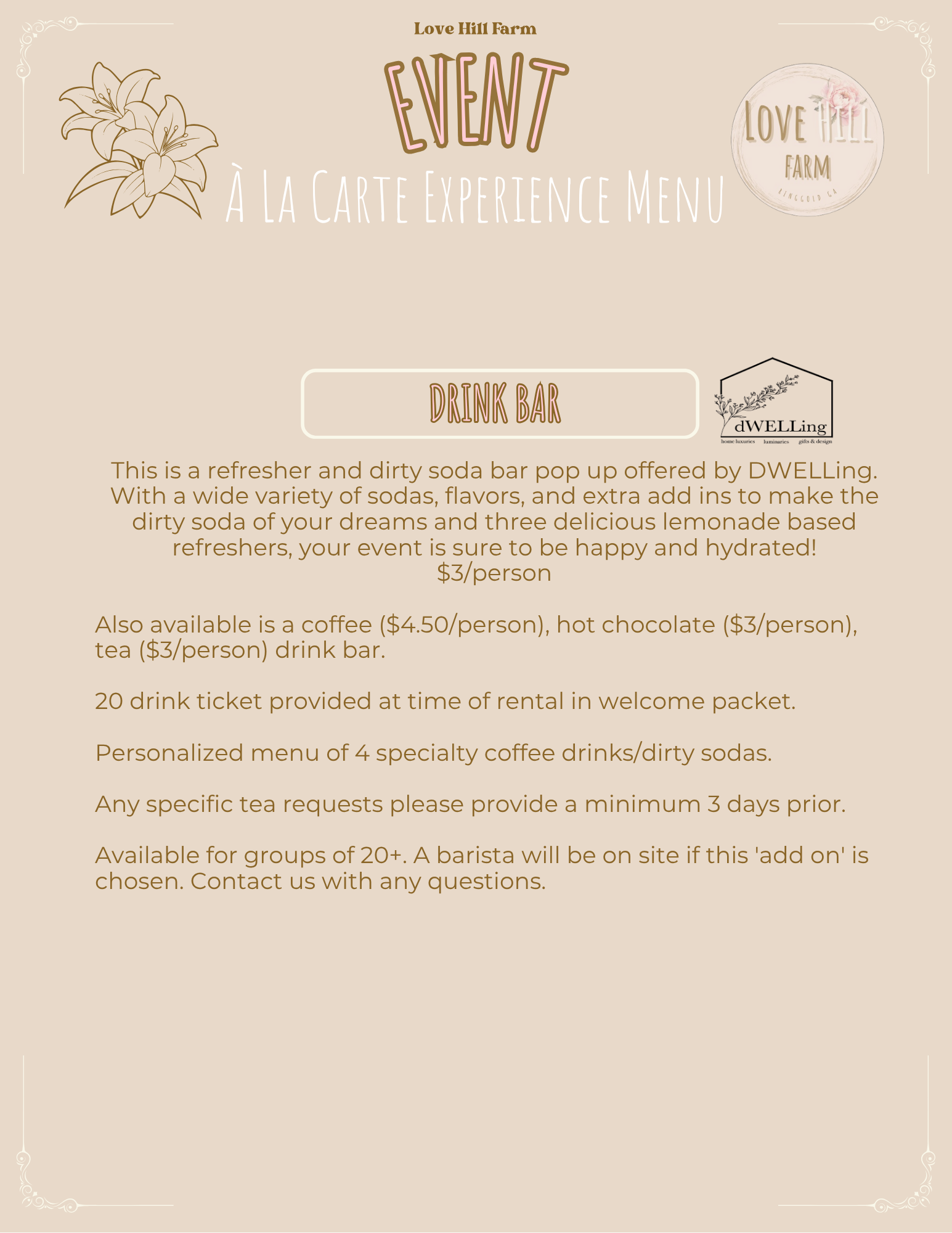 This is a refresher and dirty soda bar pop up offered by DWELLing. With a wide variety of sodas, flavors, and extra add ins to make the dirty soda of your dreams and three delicious lemonade based refreshers, your event is sure to be happy and hydrated!